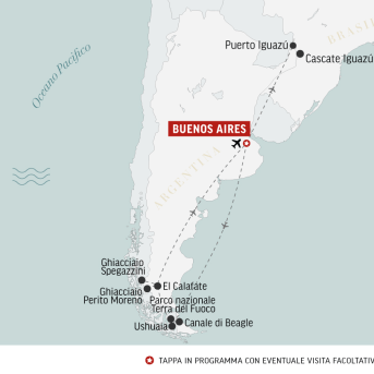 Dall’altra parte del mondo. Voleremo poi all’estremo Sud, in quella Terra del Fuoco dove maestosi ghiacciai, iceberg galleggianti e cieli sconfinati dominano un paesaggio che sembra provenire da un altro mondo. Arriveremo infine al lato opposto dell’Argentina, lungo il confine col Brasile, per ammirare quelle Cascate Iguazú che sono uno degli spettacoli naturali più emozionanti al mondo, tra i mille colori della rigogliosa foresta tropicale. Dopo una breve incursione dal lato brasiliano, ripartiremo con la meraviglia di una natura esuberante ed esotica negli occhi.