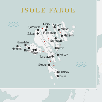 Dedichiamo la giornata alla visita dell’isola di Vagar. Vediamo il minuscolo villaggio di Gàsadalur, fino a pochi anni fa raggiungibile solo via mare, e l’iconica cascata Mulafossur, che sfocia direttamente in mare: l’imperdibile foto di questi due elementi perfettamente allineati può diventare uno dei ricordi indelebili del viaggio. Sostiamo al suggestivo villaggio di Bøur, con gli imponenti faraglioni e l’isolotto Holmatindur sullo sfondo. Il pranzo è libero. Nel pomeriggio, condizioni del mare permettendo, effettuiamo un’emozionante escursione in traghetto per la remota isola di Mykines, abitata da 11 persone e migliaia di pulcinelle di mare, che esploriamo con una esperta guida geo local. Rientriamo in hotel per la cena.