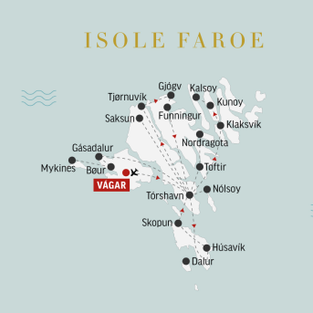 Dedichiamo la giornata alla visita dell’isola di Vagar. Vediamo il minuscolo villaggio di Gàsadalur, fino a pochi anni fa raggiungibile solo via mare, e l’iconica cascata Mulafossur, che sfocia direttamente in mare: l’imperdibile foto di questi due elementi perfettamente allineati può diventare uno dei ricordi indelebili del viaggio. Sostiamo al suggestivo villaggio di Bøur, con gli imponenti faraglioni e l’isolotto Holmatindur sullo sfondo. Il pranzo è libero. Nel pomeriggio, condizioni del mare permettendo, effettuiamo un’emozionante escursione in traghetto per la remota isola di Mykines, abitata da 11 persone e migliaia di pulcinelle di mare, che esploriamo con una esperta guida geo local. Rientriamo in hotel per la cena.