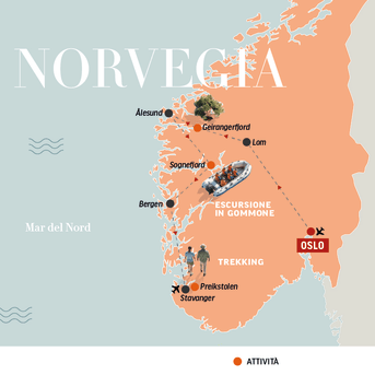 8 giorni per una vacanza attiva circondati dal fascino dei fiordi norvegesi, tra escursioni a piedi e in gommone e visite a Oslo, Lom, Geiranger, Ålesund, Sognefjord, Bergen e Preikestolen.