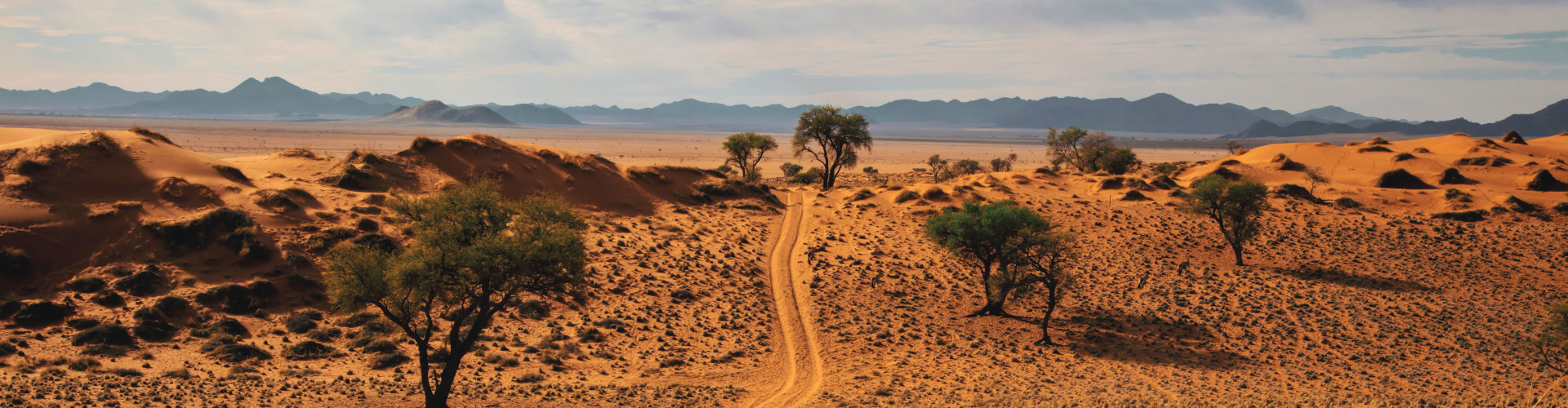 Le dune rosse del deserto del Namib, tra le più alte al mondo, si trasformano con la luce del giorno creando scenari sempre diversi. Le distese aride si alternano a coste selvagge e a zone dove la fauna si concentra attorno a poche risorse d’acqua.