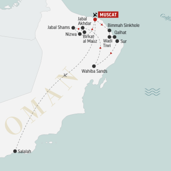 Le destinazioni, le visite, le attività, le escursioni, e tutto quello che succede, tappa dopo tappa, partendo da Muscat e attraversando un territorio incantevole.